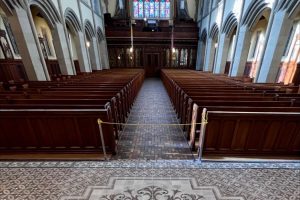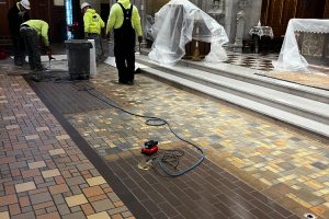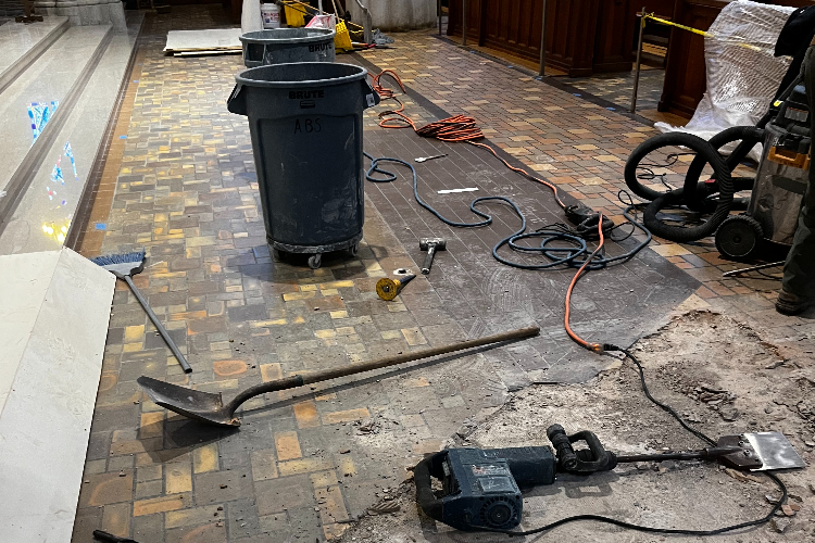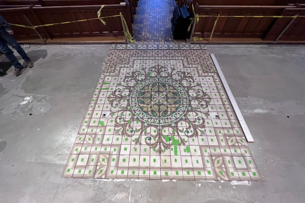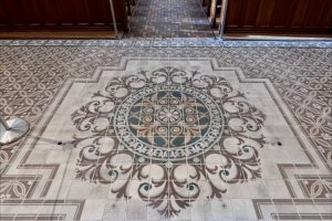 Piece by piece, the salvaged tile was installed, reintroducing patterns that felt both new and deeply familiar. The sanctuary floor began to unify again—not as a replica of the past, but as a continuation of it. The craftsmanship honored the original makers while reflecting the care of those entrusted with its renewal.